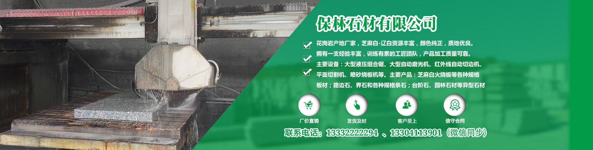 莊河市保林石材有限公司主要產品有噴砂板、火燒板、磨光板、機刨板、廣場板、外墻干掛板、樓梯踏步板、盲道板等各種板材和路邊石、界石等各種規格條石;馬蹄石、擋車石球、石柱、界碑、里程碑、工程碑、欄桿、欄板、門牌石、墓園石材、園林石材等異型石材和石雕產品。可承攬大型建筑道路、園林、公墓工程石材供貨。公司于2016年取得ISO質量和環境體系認證。公司旗下設有石材加工廠,主要經營石材加工、銷售、墓園石雕、土方石工程施工。主要設備有大型液壓組合鋸、紅外線自動切機、噴砂板、燒板機、挖掘機等國內先進設備,技術熟練,工藝先進。